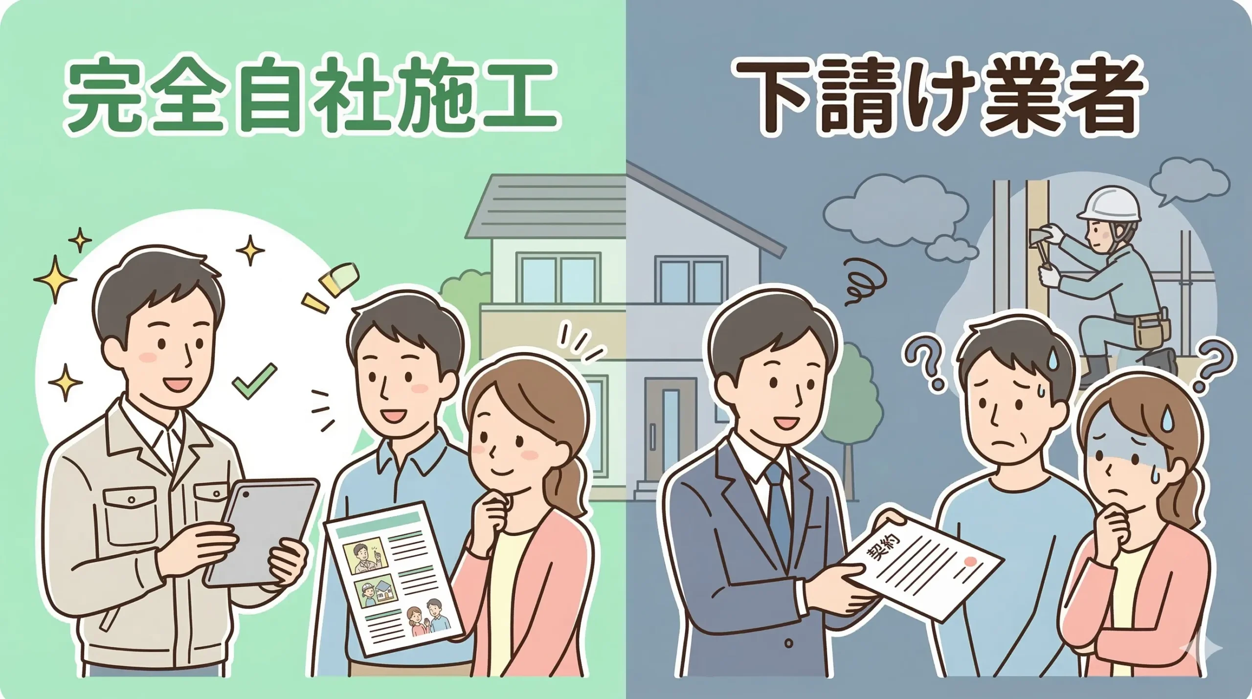 完全自社施行の会社は、業者の責任と技術が現場の隅々まで行き届くため、中間マージンを排除した「適正価格」と「高品質な施工」を両立できます。連携ミスや手抜きのリスクを未然に防ぐことができます。